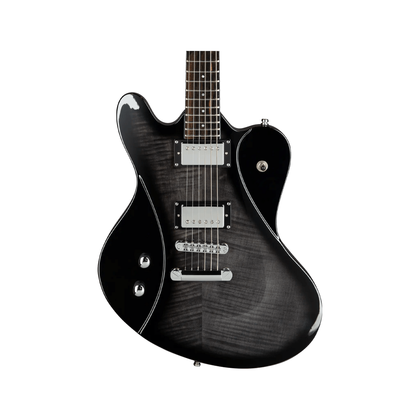 The Framus Pro Series Idolmaker Left-Handed in Nirvana Black Transparent High Polish is a premium German-made guitar designed for discerning left-handed players. Its AAAA flamed maple top and solid mahogany body deliver warm mids, rich sustain, and crystal-clear highs. The set-in mahogany neck and Tigerstripe ebony fretboard provide smooth playability across all 22 jumbo frets.
