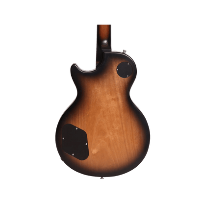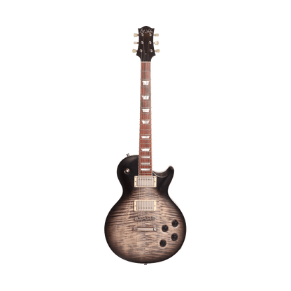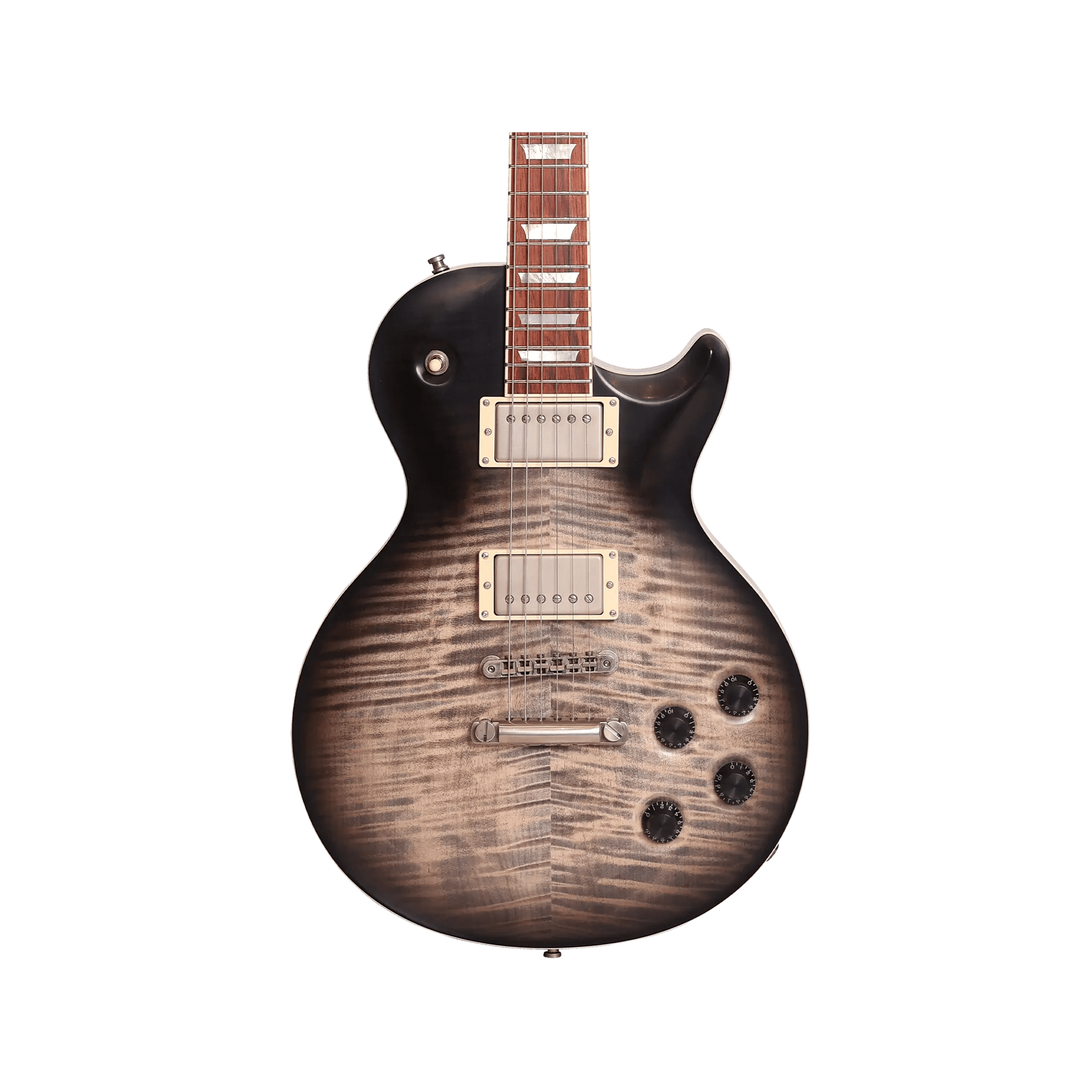 With a fat back Mahogany like Spanish Cedar body and the most exceptional Curly Maple top it is beautifully balanced and the deep charcoal semigloss finish is just stunning.