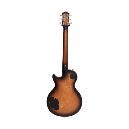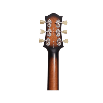 The Mahogany neck feels great underhand, with a 25" scale length, 22 medium jumbo frets and a 10"-14" compound radius, it's a modern design with a real vintage heart. The bound Brazilian Rosewood fingerboard looks stunning and feels ever better, perfectly complementing the aesthetic, every element of this guitar has been considered to the highest level. The Mother of Pearl Crown Trapeze inlays adding a nice take on the traditional aesthetic.