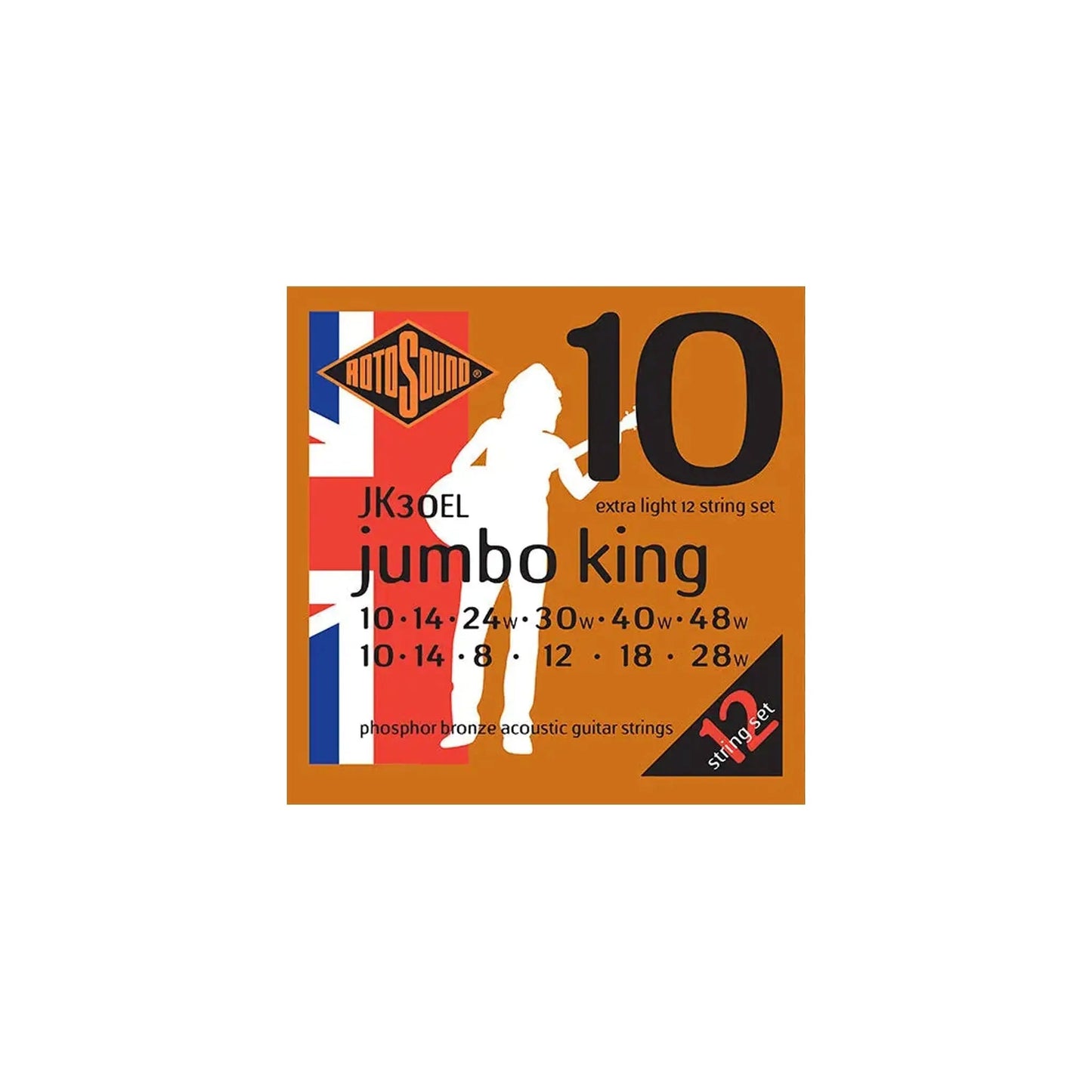 A set of strings designed for 12-string acoustic guitar from Jumbo King series. They are made of 92/8 bronze alloy with roundwound winding, similar to piano strings. They offer a balanced and full tone.