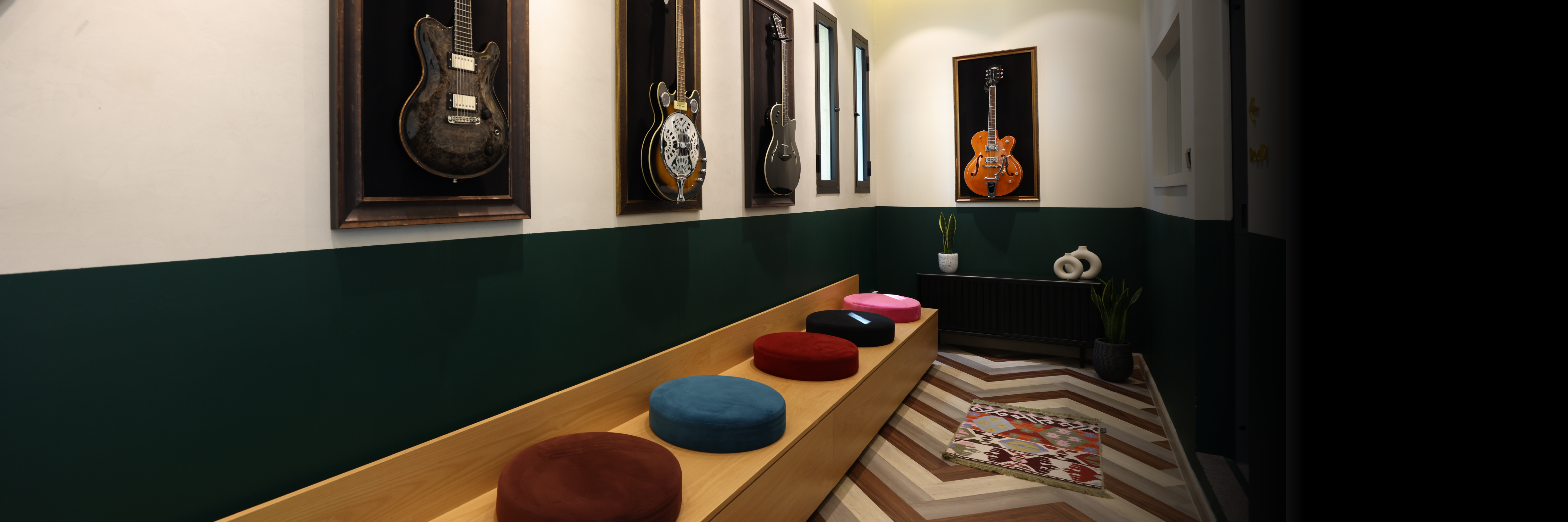 A unique feature of Art of Guitar is that we are the only guitar business and music academy globally run by women, allowing us to focus on empowering female guitarists through our marketing, events, and product offerings. We provide them with a stage to be recognized by top guitar brands. Our store design is colorful, engaging, and welcoming—shifting away from the traditional "man-cave" look into a cozy lounge. Situated in Dubai's historic Courtyard, our space celebrates the region’s art and history, featuring restored Middle Eastern architecture, fountains, wind chimes, and a serene atmosphere. This beautiful, sustainable location offers the perfect environment for musicians to play, with humidity-controlled instrument storage, pro audio rooms, and soundproofed spaces for lessons.