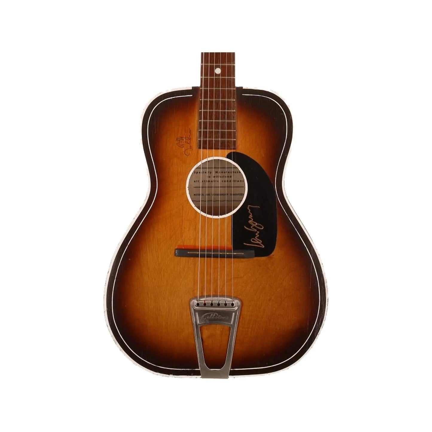 Beatles interest - 1950s Gallotone Champion small body acoustic guitar bearing a John Lennon decal to the top, the pickguard autographed by Len Garry