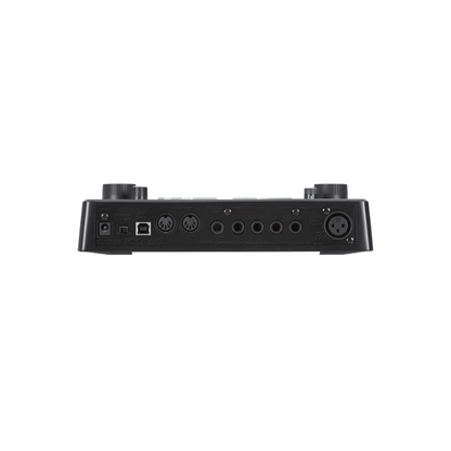 • XLR mic input with phantom power, mono/stereo instrument inputs, and stereo aux input