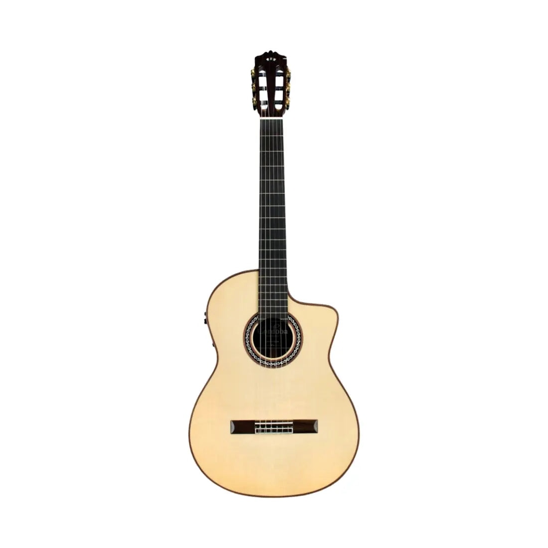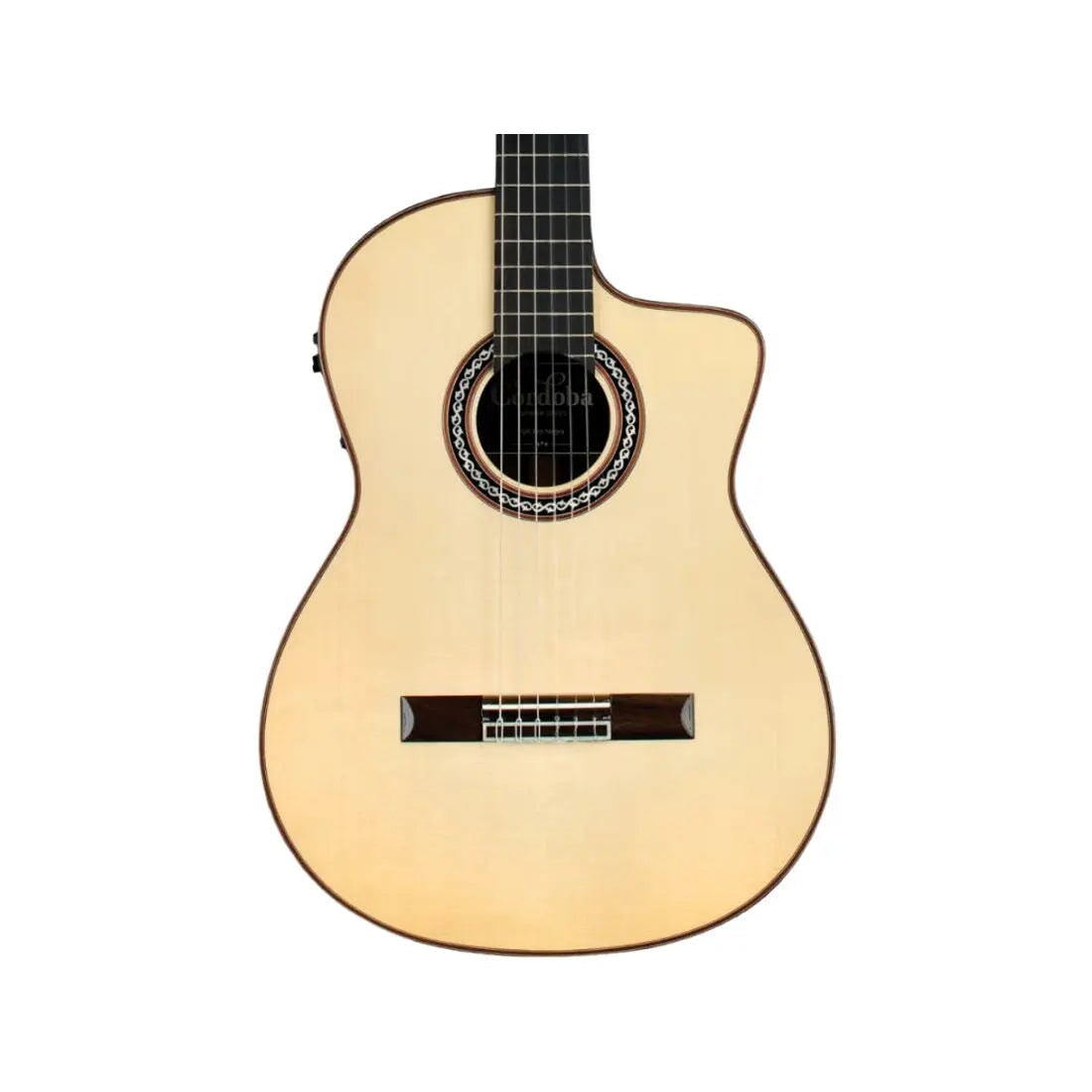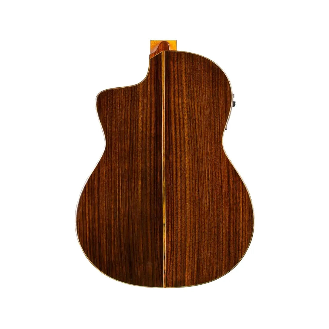 The GK Pro Negra is the ultimate gigging nylon string guitar for professional musicians. All-solid with a European spruce top and Indian rosewood back and sides, it comes equipped with a soft cutaway and Fishman PreFix ProBlend preamp. When compared to the blanca version (GK Pro), the Negra offers a darker, bassier tone. Constructed with a slightly thinner body depth, neck, and nut width than a traditional Spanish guitar, the GK Pro Negra is extremely comfortable & easy to play. The neck is designed to have little or no relief, offering low action and a flamenco-style buzz and its Spanish heel provides maximum resonance and projection. Comes in a Córdoba humidified archtop case.