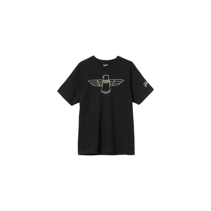 Celebrate the low-end in style with this black crew-neck T-shirt emblazoned with the stylized white emblem of Gibson's legendary Thunderbird Bass. The lightly distressed vintage-look print adorns a comfortable 60/40 cotton/polyester-blend T with matching white "Gibson" logo on the left sleeve.