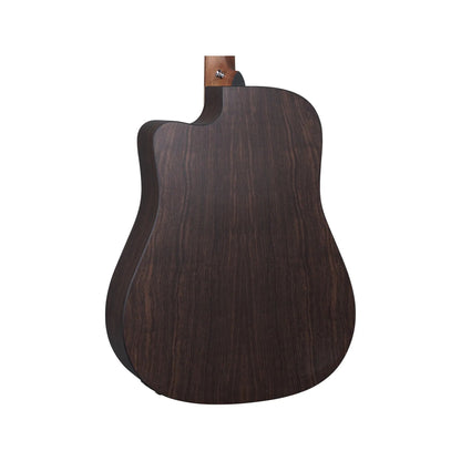 This Dreadnought sized model features a cutaway body with a Sitka spruce top and figured rosewood pattern high-pressure laminate (HPL) back and sides.