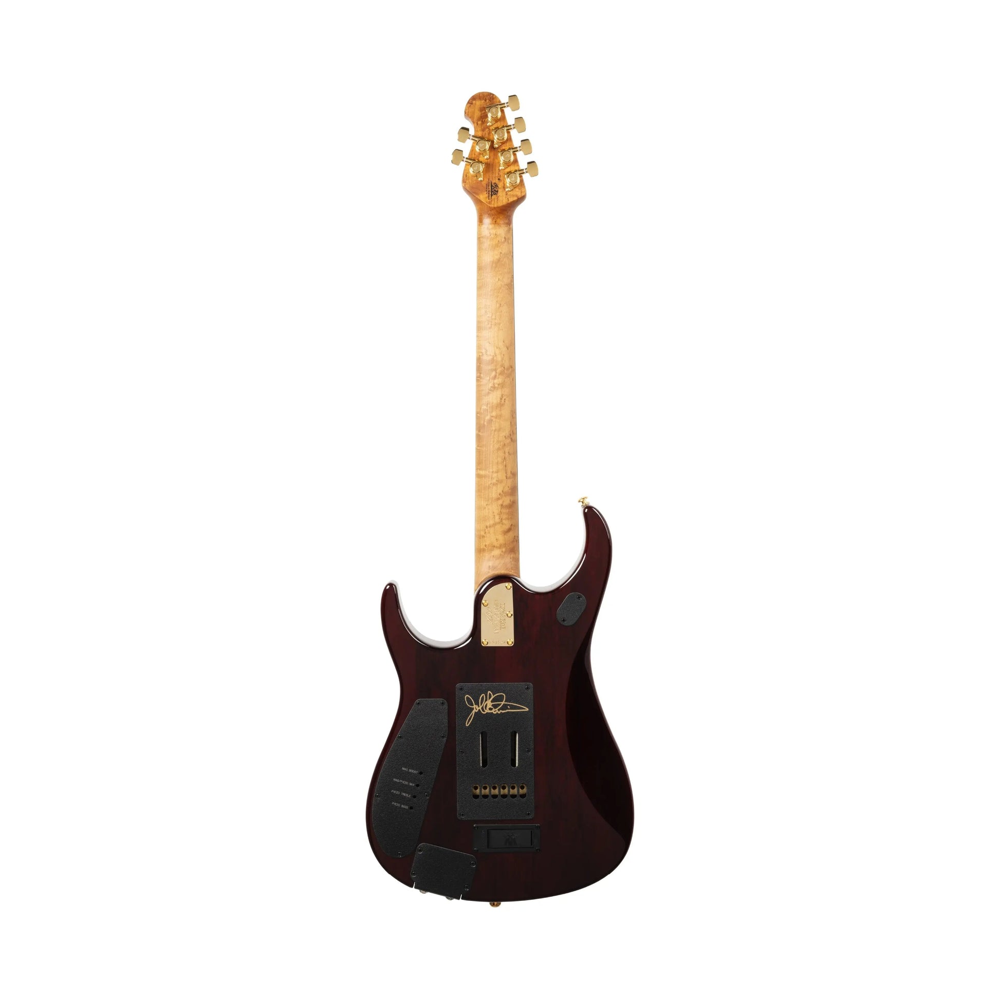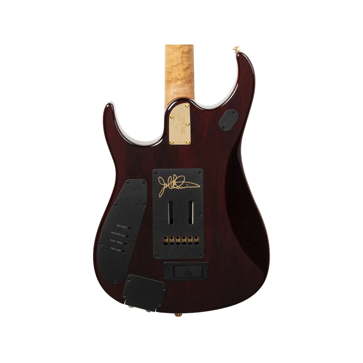 The limited edition Ball Family Reserve JP15 features a black limba body with a buckeye burl top, offering a unique and striking aesthetic. Available in two exclusive finishes, Toxic Sludge and Solar Flare, each guitar is part of a limited run of 100 units per finish. The guitar includes a thin and fast roasted figured maple neck with a hand-rubbed oil and wax finish and an ebony fretboard, delivering a smooth playing experience with enhanced stability and brightness. Equipped with custom DiMarzio Sonic Ectasy pickups, a piezo bridge system for convincing acoustic tones, and an onboard 20dB gain boost, the JP15 offers versatile output options, including mono or stereo with the ability to route the piezo to a separate signal chain. Each guitar comes with a tremolo cover signed by John Petrucci and a numbered Certificate of Authenticity, making it a true collector’s piece.