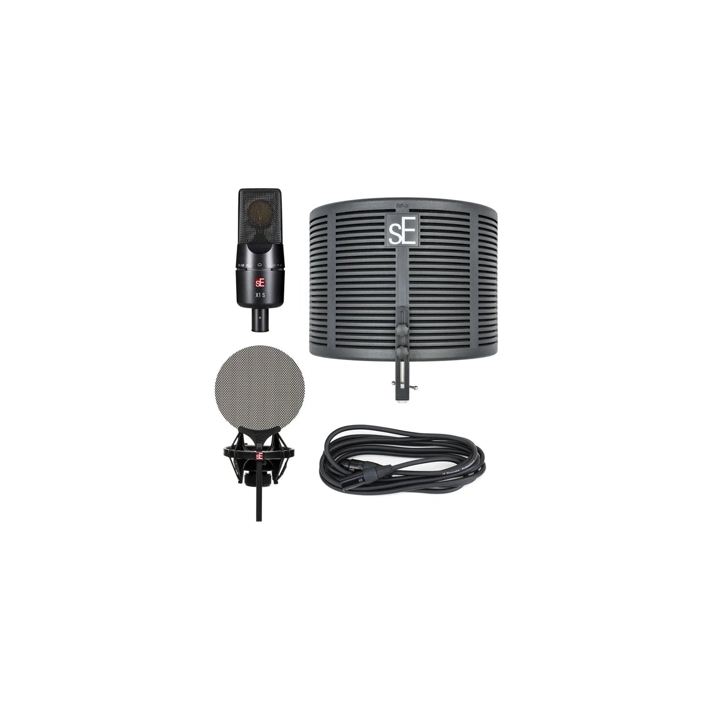 The SE Electronics X1 S Studio Bundle is a large-diaphragm condenser microphone and accessory package designed for vocal and instrument recording in project studios, home setups, mobile rigs, and commercial facilities. It includes the X1 S cardioid studio condenser mic, an RF-X reflection filter, a pop filter, shockmount, and a 10’ microphone cable.